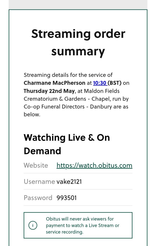 Charmane’s funeral will be on Thursday 22nd May 10.30am at Maldon Fields Crematorium CM9 6SN