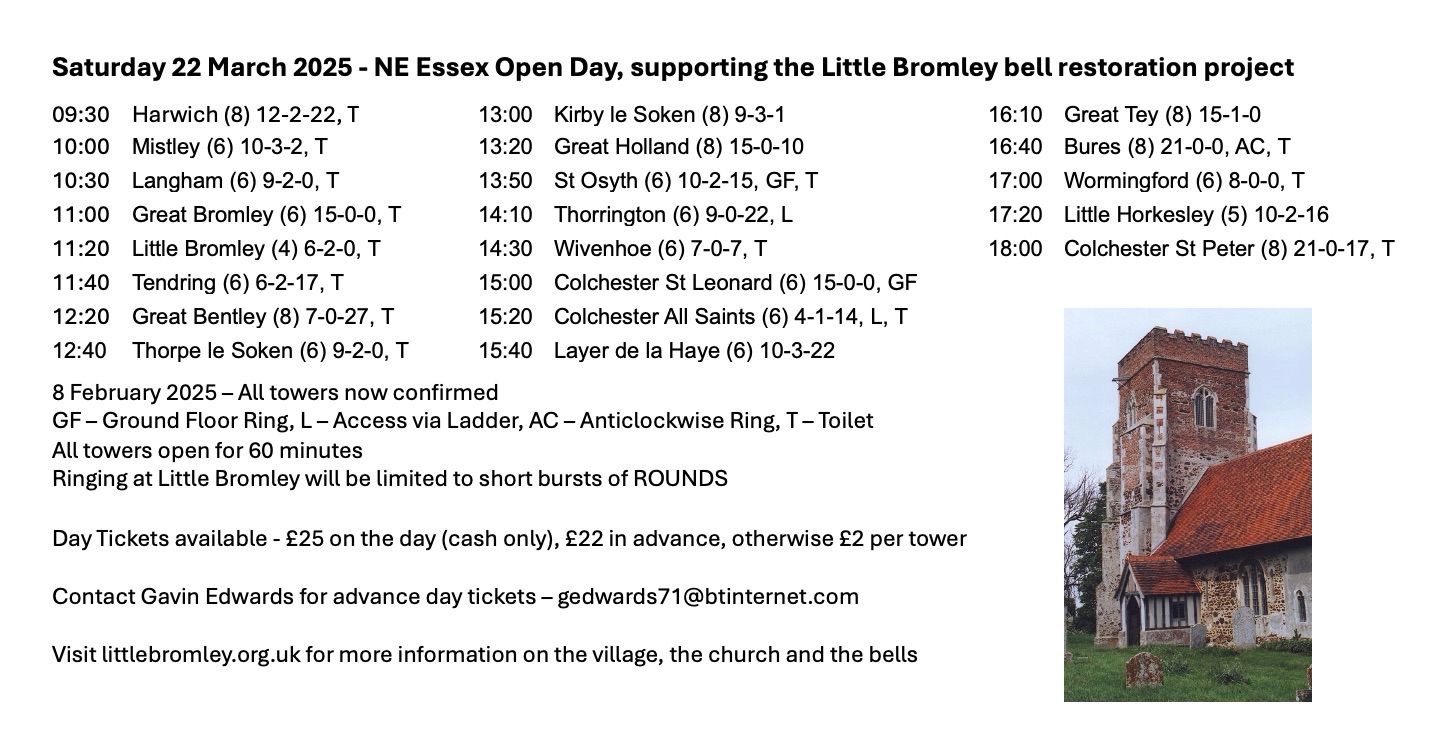 The Friends of Little Bromley Church, with the help of the ringers and towers of the NE District of the Essex Association of Change Ringers, invite you to join us for a tower open day on Saturday 22 March, in support of the Little Bromley bell restoration project.